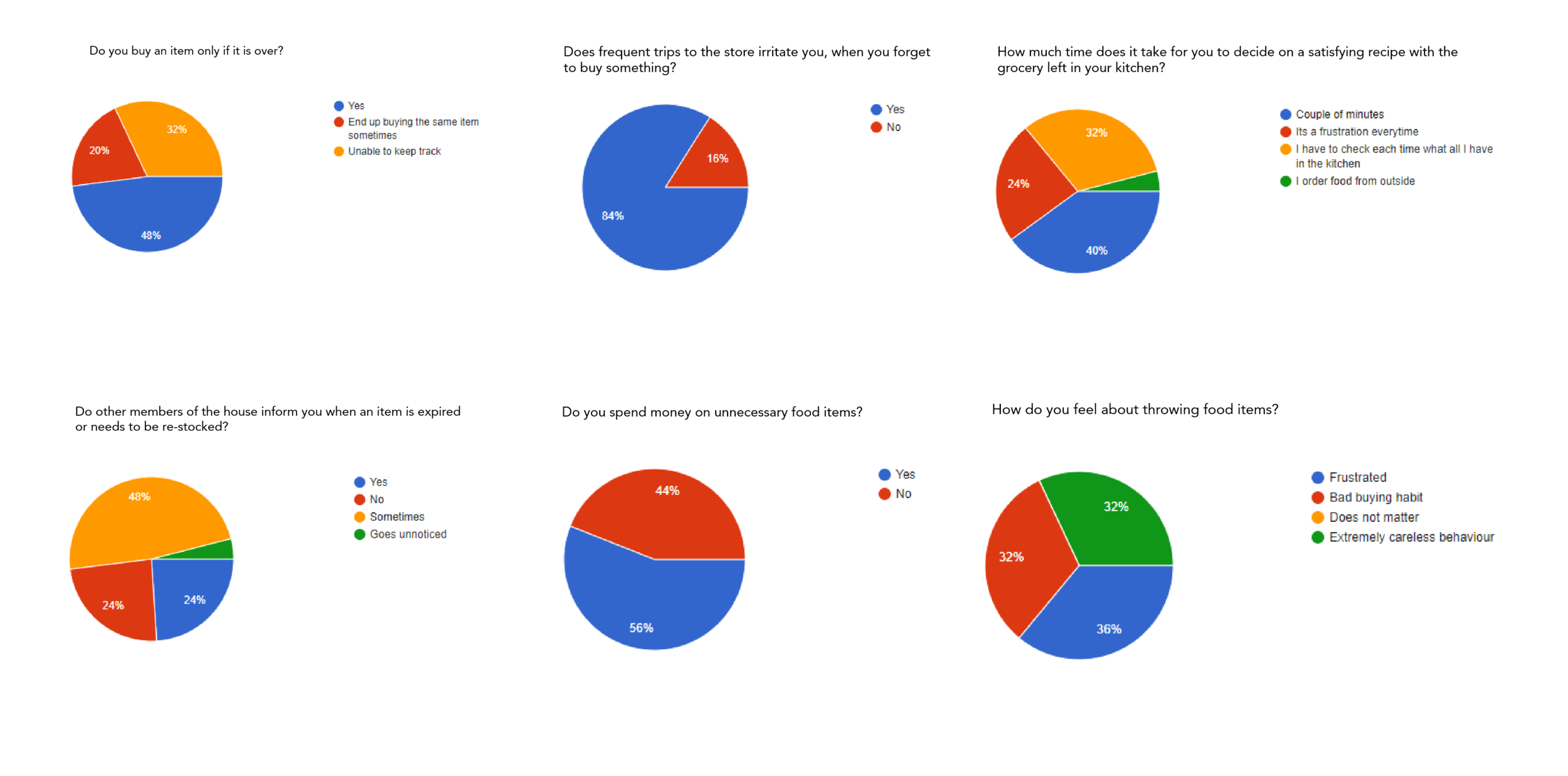 A total of 30 individuals took part in the survey and the target audience was people aged between 20 - 40 years. Online surveys are a part of quantitative research so as to include more individuals in the research process to understand the small details of their experiences. Survey questions majorly included questions about the user’s visitation to the grocery store, frequency of food wastage, and time is taken to decide on meals. The target audience was mostly young college people who stay in shared spaces, single professionals, and married working women with family.