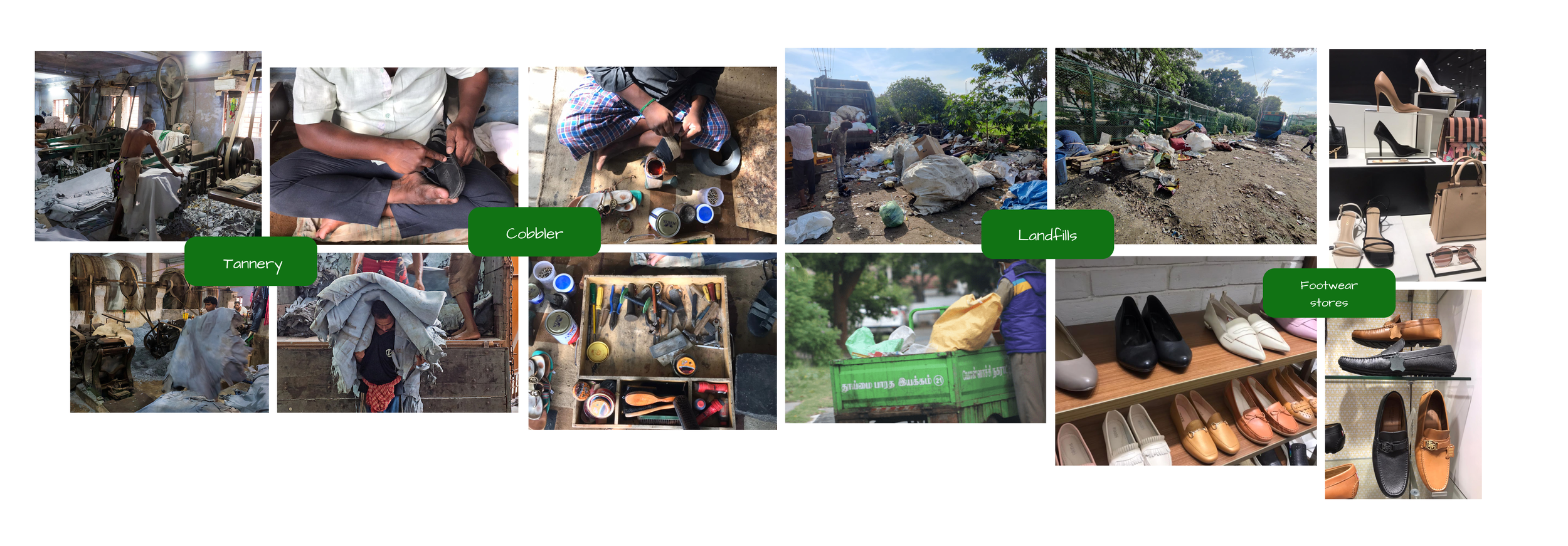 In order to understand the manufacturing of leather shoes and the stakeholders involved we carried out a field visit in which interviews were taken to understand the core problem. There we looked into 4 aspects of leather production - tanneries(manufacturing), cobblers (fix and assembly), leather shoe stores, and rag pickers from dump yards to betters understand the behavioral aspects of various users.